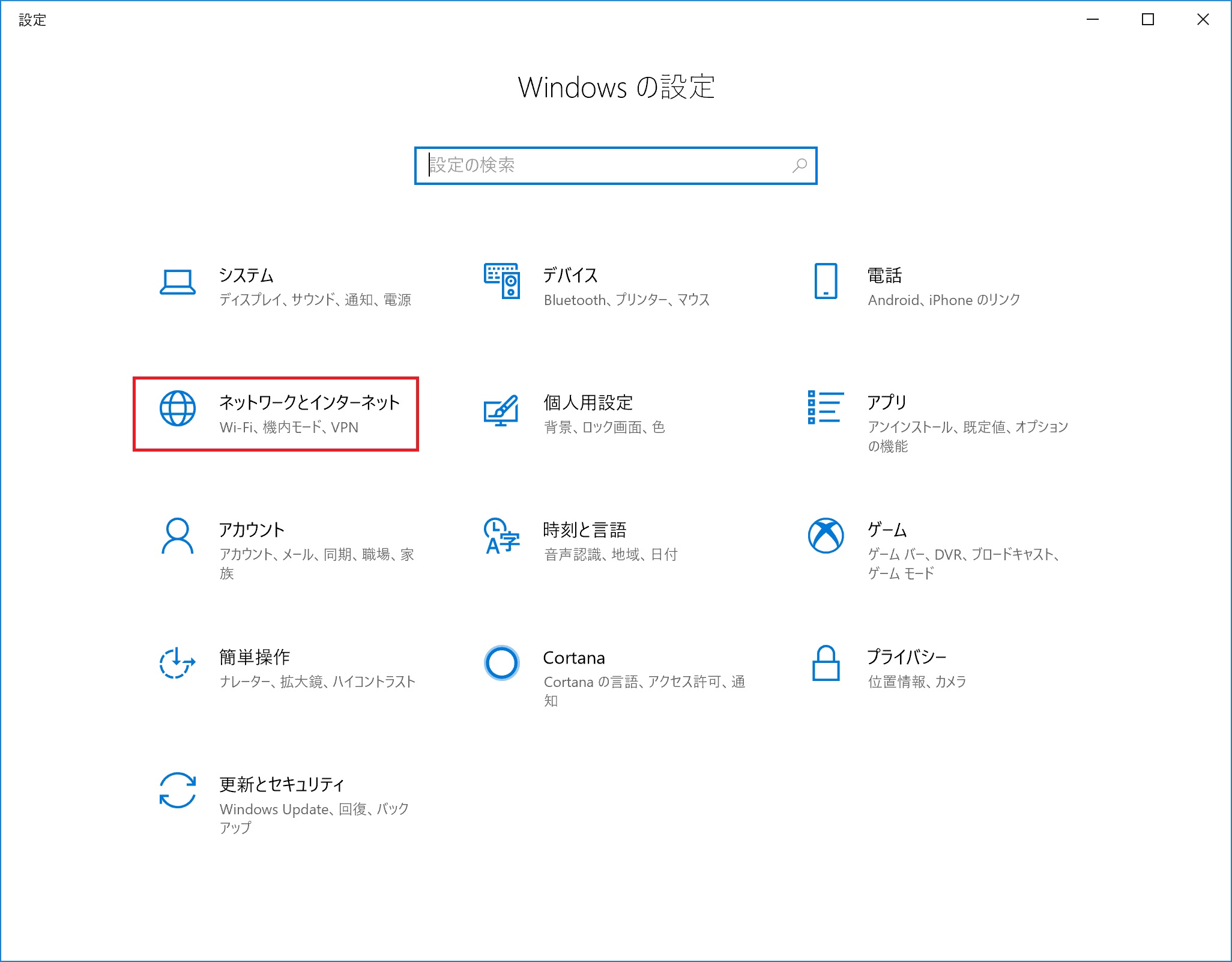 [Windows の設定]から、[ネットワークとインターネット]をクリックします。