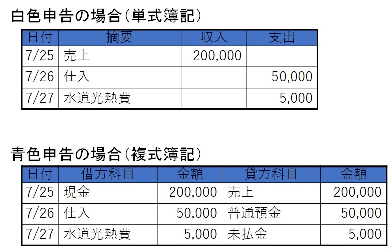 税制面で優遇されているのは、青色申告です。なぜかと言うと、記述が複雑な分、ごまかしが効きにくいからです。例えば、得意先から代金を銀行振込で受け取った場合、