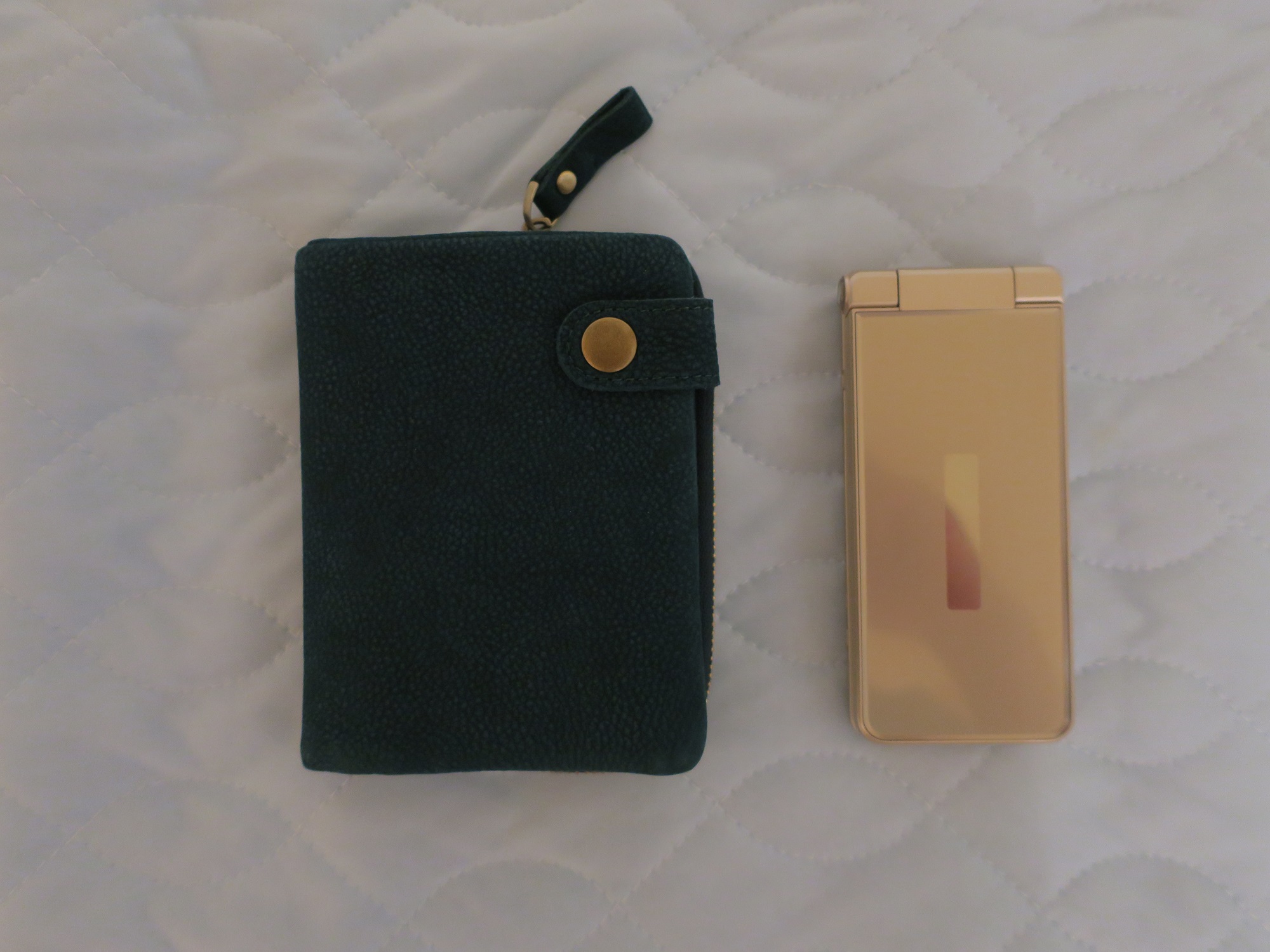 大きさは、この写真を見るとわかりやすいかと思います。さすがにガラケーと同じ大きさとは行きませんが、お財布としては小さく、手帳サイズです。