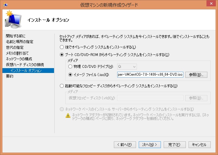 ネットワークアダプタを、どの仮想スイッチに接続するかを指定します。もし仮想スイッチをつくていない場合、「接続しない」しか選択できません。もしCentOS 7からインターネットや、別のコンピュータに接続する場合、あらかじめ仮想スイッチを作っておく必要があります。ま、とりあえずCentOS 7を触ってみたいのであれば、「接続しない」でも問題ないと思います。
